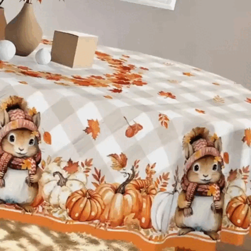 Acornia™ is a rustic Thanksgiving tablecloth designed to bring warmth and charm to your dining table. The squirrel and pumpkin design adds a touch of autumn, making it the perfect choice for Thanksgiving dinners or cozy family meals. The high-quality fabric ensures that it will stand up to the test of time, and the easy-to-clean material makes it practical for both casual and formal occasions.