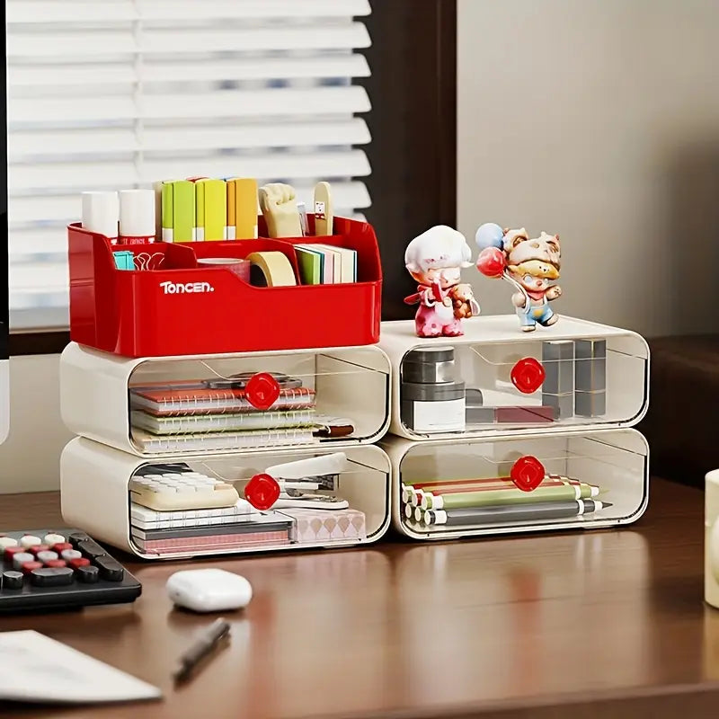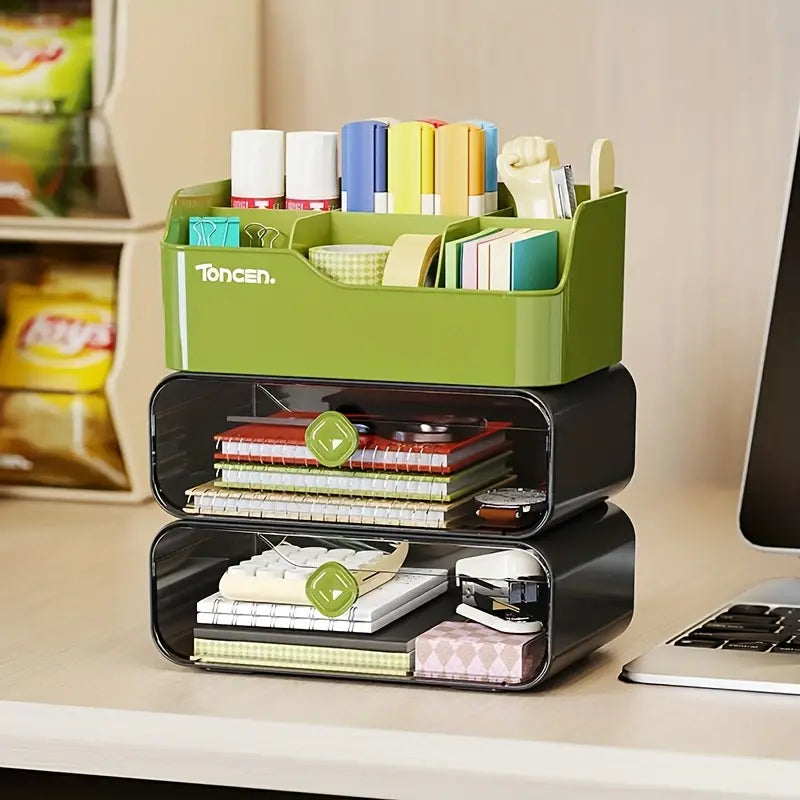 The Averis™ Desk Organizer features a durable PP storage box with drawers in green and black, offering a stylish and functional solution for workspaces. Its multi-tier structure keeps documents, stationery, and small items neatly arranged. Lightweight and portable, it’s perfect for home, office, or study areas.